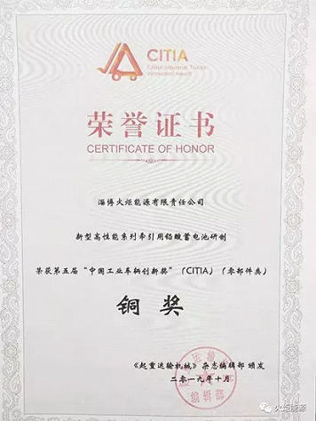10月18日,中國工程機械工業協會工業車輛分會七屆三次會員代表大會暨2019年年會在河北唐山勝利召開。會議對前期評審的第五屆“中國工業車輛創新獎”(CITIA)(零部件、管理和服務類)獲獎企業進行了表彰,風帆火炬公司作為十一家獲獎企業之一,參評的“新型高性能系列牽引用鉛酸蓄電池研制”項目榮獲銅獎,成為蓄電池類項目唯一獲獎廠家。