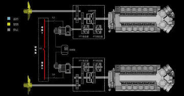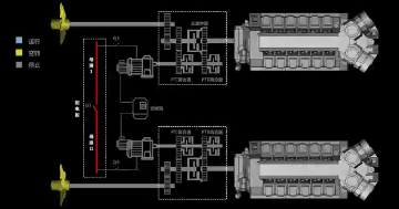 “海巡06”船主動力系統(tǒng)采用七一一所自主研發(fā)的柴電混合動力控制系統(tǒng),配有智能化PTO/PTI切換控制裝置,便于船員切換進入一機雙槳模式,即其中一舷的主機在驅(qū)動螺旋槳同時驅(qū)動軸帶電機發(fā)電(運行在PTO模式),通過配電板供電給另一舷軸帶電機(運行在PTI模式)驅(qū)動螺旋槳。這樣的設計有利于在船舶低速航行時提高主機負荷,降低主機的燃油消耗率,降低碳排放,提高經(jīng)濟性。
