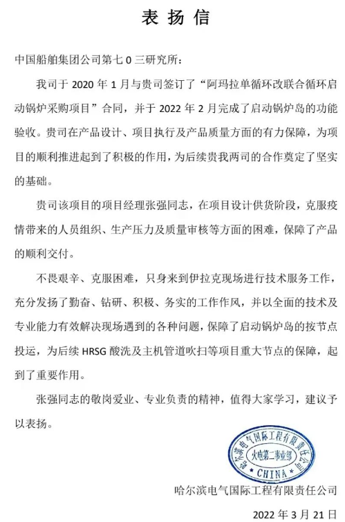 3月21日,中國船舶集團七〇三所收到了一封來自伊拉克項目現場的表揚信,信中對七〇三所設計供貨的“阿瑪拉單循環改聯合循環啟動鍋爐項目”表示了認可和肯定,也對我所蒸汽動力事業部專業技術人員張強同志冒著疫情風險,遠赴伊拉克參與安裝調試,保障項目重大節點順利完成表示了感謝。