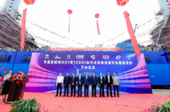武漢船機公司副總經理孫凱在下水儀式上發表講話,“華夏金租1200T 風電安裝平臺是我司承接的最新一代圓柱樁腿風電安裝平臺,也是目前國內作業水深最大、樁腿最長、主吊機吊高最高、功能最全、效率最高的圓柱樁腿風電安裝平臺,該平臺不僅綜合性能行業領先,又充分兼顧了經濟效益,對公司打造經典產品、引領未來市場發展具有重要的戰略意義。”