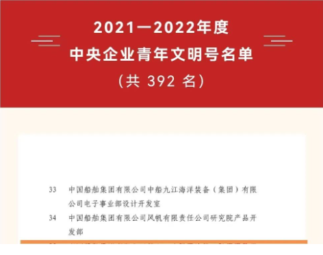 近日,中央企業團工委發布《關于表彰 2021—2022 年度中央企業五四紅旗團委、五四紅旗團支部、優秀共青團員、優秀共青團干部、青年崗位能手,命名中央企業青年文明號的決定》,中船風帆研究院產品開發部被命名為“中央企業青年文明號”。