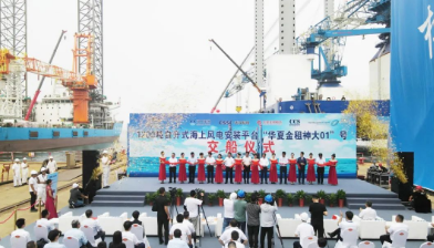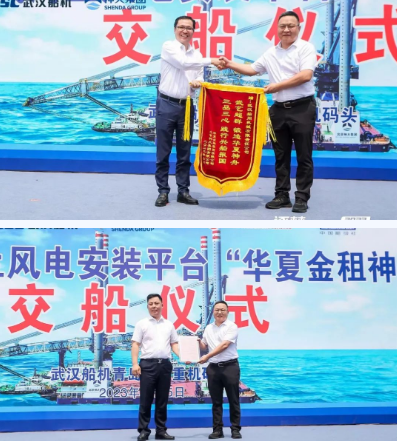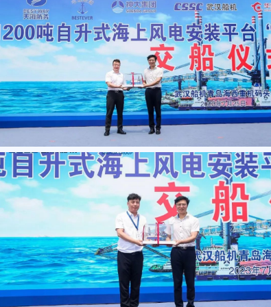 武漢船機黨委書記、董事長馬聚勇,北京神大集團有限公司總經理張曉飛,飛勵特船舶管理有限公司副總裁馬利,華夏金融租賃有限公司總裁沈宗慶先后在交船儀式上發表講話。隨著國家實現“碳達峰、碳中和”目標指引,清潔能源迅速發展,我國海上風電投入布局和建設加快。為獲取更多的海上風能資源,海上風電正向深遠海風電場拓展,華夏金租神大01號1200噸自升式風電安裝平臺因此而生,是開發深遠海風電資源的又一利器。該平臺的順利交付,不止是武漢船機依托技術創新、裝備優勢、努力拼搏的成就,更是船東、船東代表、監理、分包方共同努力耕耘海上風電市場結出的又一碩果。”