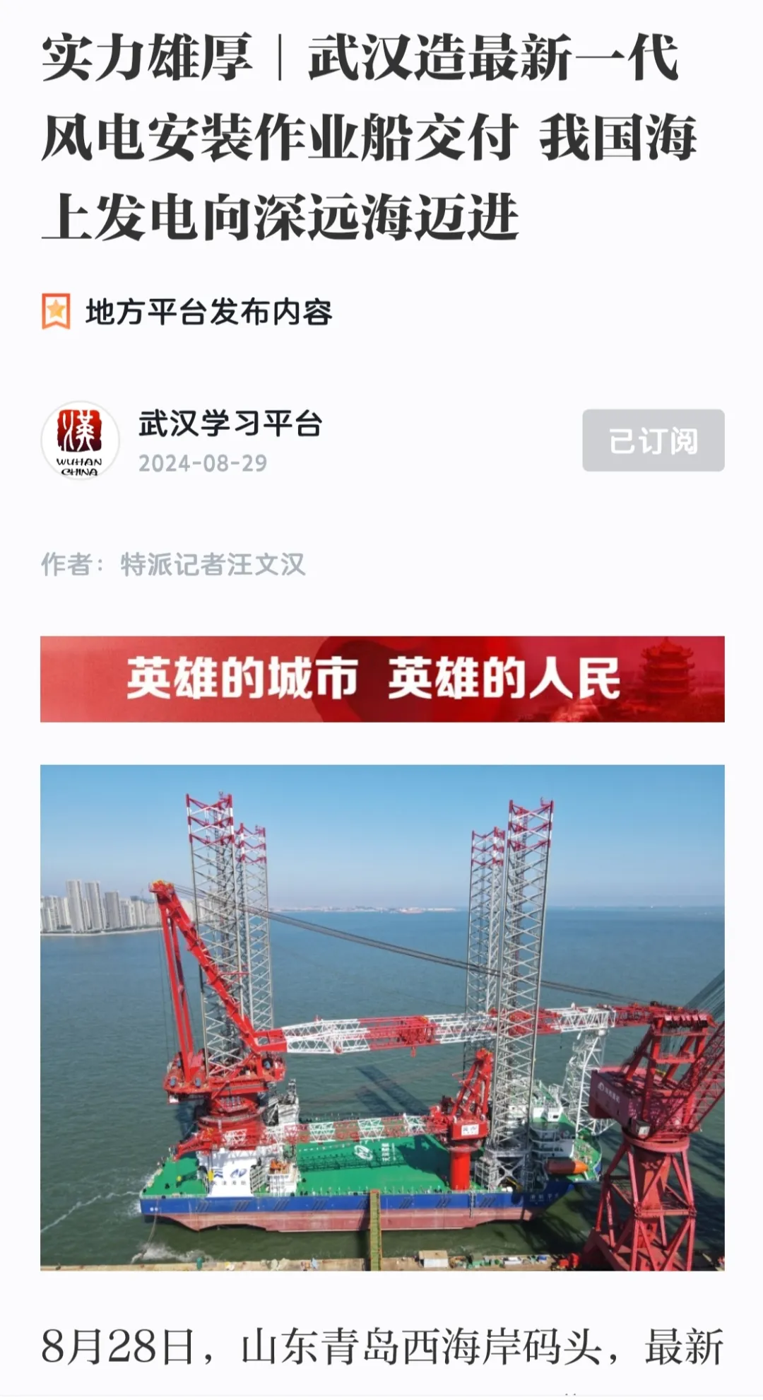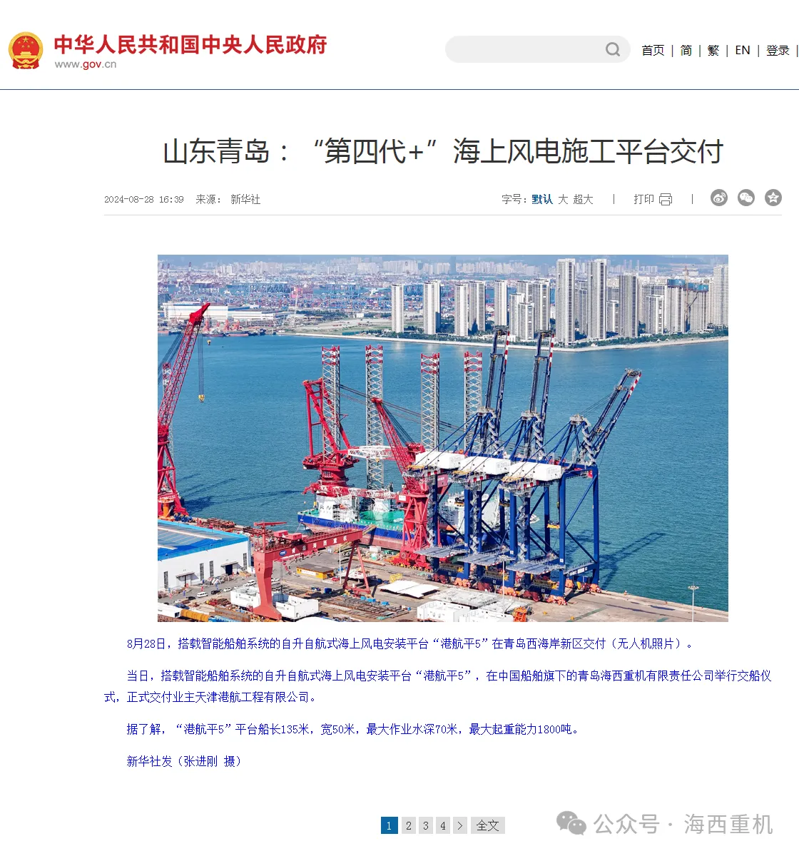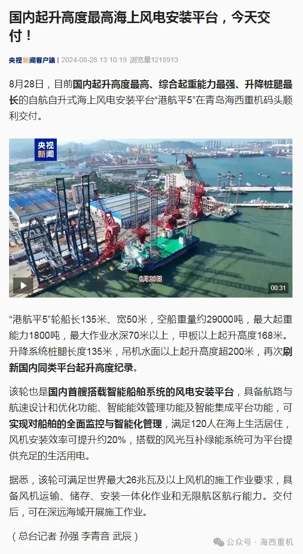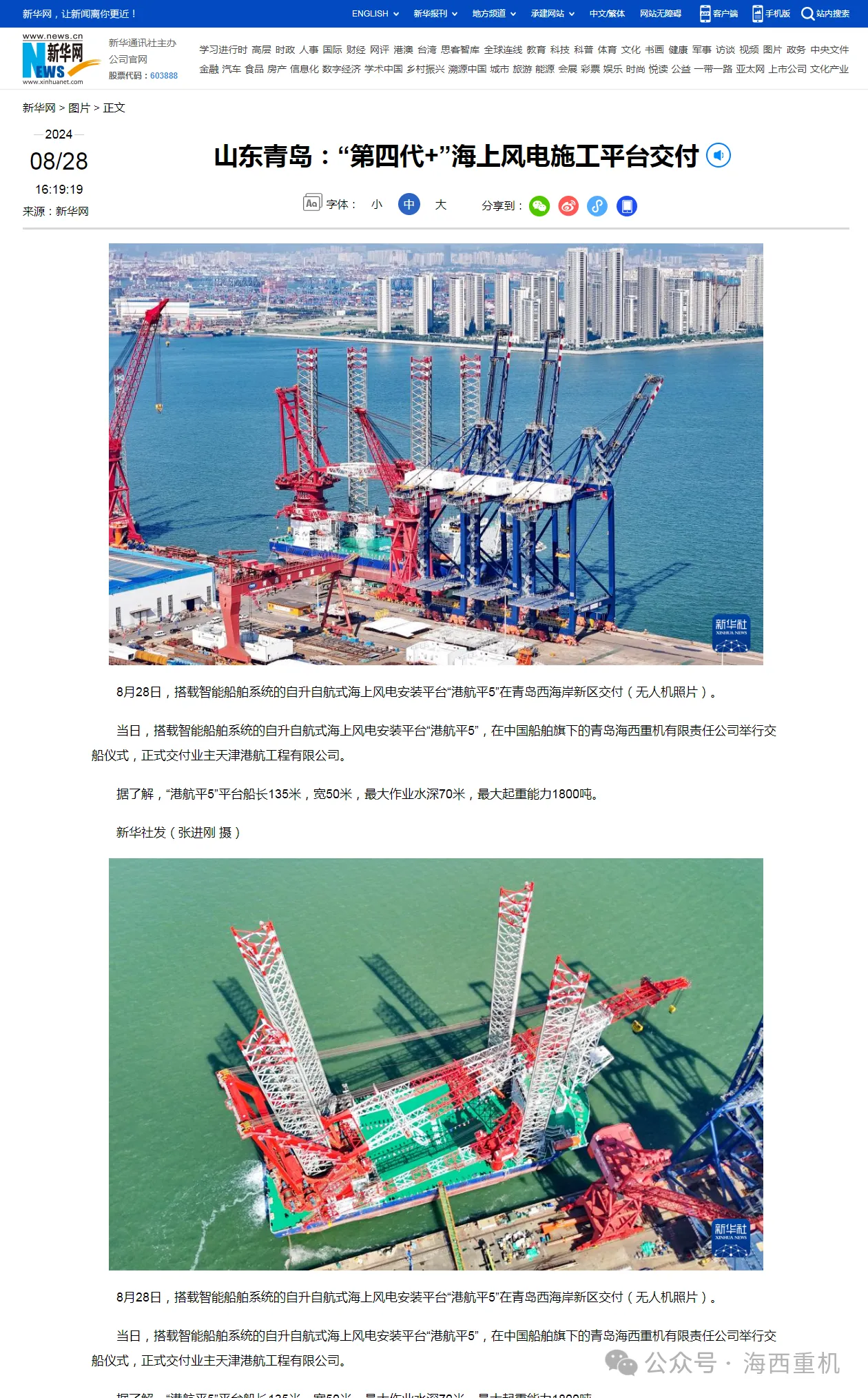 8月28日,中國船舶集團旗下中國動力子公司武漢船機牽頭建造的“第四代+”1800噸海上風電安裝平臺“港航平5”在青島海西重機順利交付! 消息一經發布,就引發各大媒體關注報道!