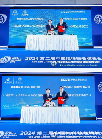 大會期間,中船動力與福建船政重工股份有限公司簽訂8船套 5500PCTC汽車滾裝船主機采購協議及15船套12000噸自航駁船主機+主發電機組采購協議。其中,12000噸自航駁船主機+主發電機組共計75臺中速機,創下了雙方合作以來單批次簽單歷史新高,進一步加深了雙方在綠色動力領域的合作。