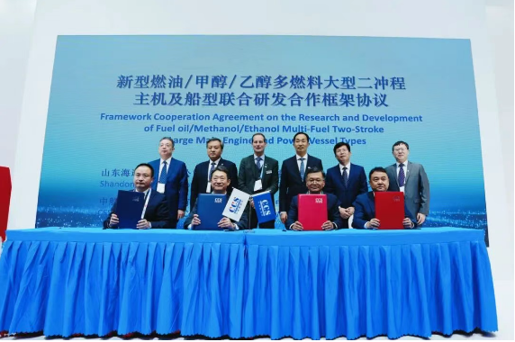 同時,山東海運股份有限公司、中國船級社、中船動力(集團)有限公司、WinGD四家單位聯合簽署《新型燃油/甲醇/乙醇多燃料大型二沖程主機及船型研發聯合開發合作協議》。助力我國“雙碳”目標與可持續發展戰略落地,為“海洋強國”、“交通強國”建設筑牢技術與產業根基,助力支持全球海事的可持續發展。