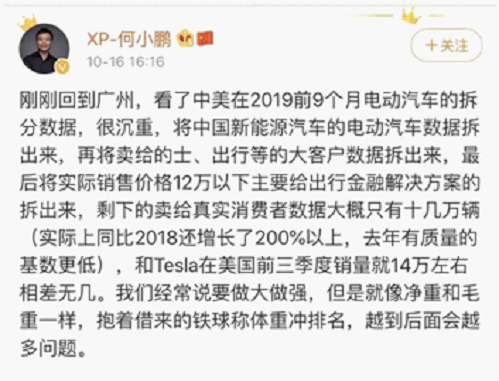 日前,小鵬汽車董事長何小鵬在其官方賬號上發文稱, 2019年前9個月,中國新能源汽車市場的電動汽車實際賣給消費者的數據大概只有十幾萬輛,和特斯拉前三季度在美國市場14萬輛的銷量相差無幾(考慮到中美人口的數量差異以及新)。原文見下圖: