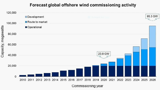預(yù)計(jì)2020年的調(diào)試活動(dòng)將略有下降,但預(yù)計(jì)到2021年將反彈至每年約3.5 GW。RCG認(rèn)為,受英國(guó)項(xiàng)目的推動(dòng),從2022年起,活動(dòng)將顯著增加,達(dá)到每年6 GW以上的速度。 ,法國(guó),臺(tái)灣,美國(guó)和荷蘭。