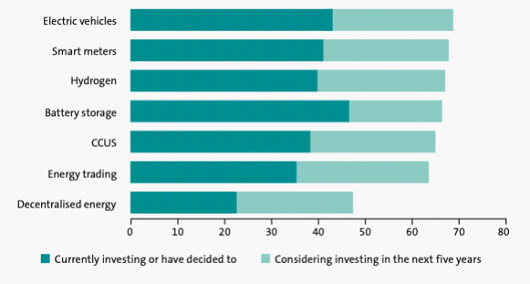 智能電表和氫儲(chǔ)能在當(dāng)前和計(jì)劃投資模式中也表現(xiàn)突出,分別有41%和40%的受訪者選擇這兩種非發(fā)電能源技術(shù)。
