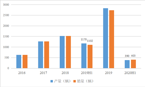 圖1 中國2016-2020H1燃料電池汽車產銷量