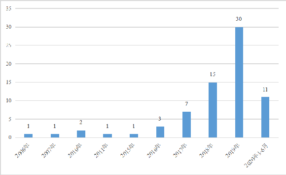 圖2 中國2006年-2020年1-6月建成加氫站情況