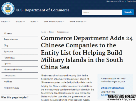 8月26日,美國商務(wù)部網(wǎng)站發(fā)布新聞稿稱,商務(wù)部產(chǎn)業(yè)安全局將24家中國企業(yè)列入美國實體清單,原因是這些企業(yè)“幫助中國軍方在南海修建人工島”。