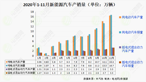 其中,11月,新能源汽車產銷分別完成19.8萬輛和20萬輛,同比分別增長75.1%和104.9%,其單月產銷第5次刷新了當月歷史記錄。其中純電動汽車產銷分別完成16.4萬輛和16.7萬輛,同比分別增長66.2%和100.5%;插電式混合動力汽車產銷均完成3.3萬輛,同比分別增長136.4%和128.9%;燃料電池汽車產銷分別完成288輛和290輛,同比分別增長7.2倍和28倍。