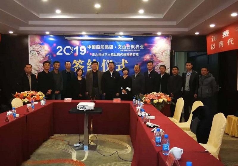 2019年12月22日,中國(guó)船舶集團(tuán)-云南文山云楓農(nóng)業(yè)丘北縣林下養(yǎng)雞“以購代捐”采購訂單簽約儀式在云南丘北縣舉行。