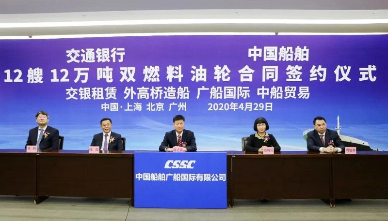 ????4月29日,中國船舶集團有限公司旗下中國船舶工業貿易有限公司、上海外高橋造船有限公司、廣船國際有限公司與交通銀行股份有限公司旗下交銀金融租賃有限責任公司在北京、上海、廣州三地以“云簽約”方式簽署12艘12萬噸雙燃料油船建造合同,合同總金額約46億元人民幣,這是中國船舶集團旗下單位近期承接的又一單筆大額訂單。中國船舶集團黨組書記、董事長雷凡培,交通銀行黨委書記、董事長任德奇,中國船舶集團黨組成員、副總經理孫偉,交通銀行黨委委員、副行長呂家進出席簽約儀式。