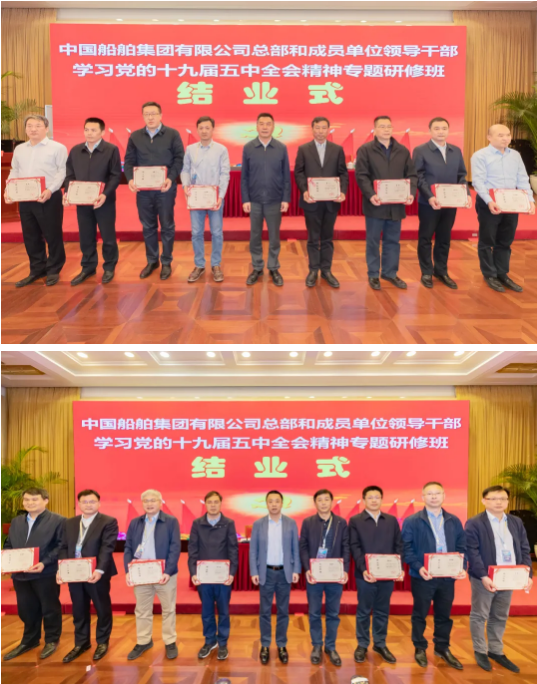 4月23日,中國船舶集團有限公司總部和成員單位領導干部學習黨的十九屆五中全會精神和黨史學習教育專題研修班圓滿結業。培訓期間,中國船舶集團黨組書記、董事長雷凡培以《深入貫徹落實習近平總書記重要指示批示精神 努力加快建設世界一流船舶集團》為題給全體學員們講授了第一課,中國船舶集團黨組副書記、總經理楊金成,黨組成員、副總經理孫偉、盛紀綱以及相關部門負責人先后出席各期結業式并聽取了學員們的學習匯報。