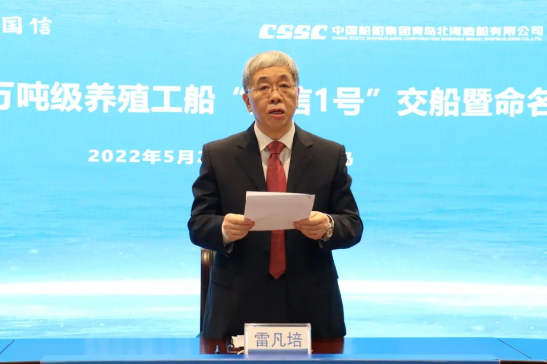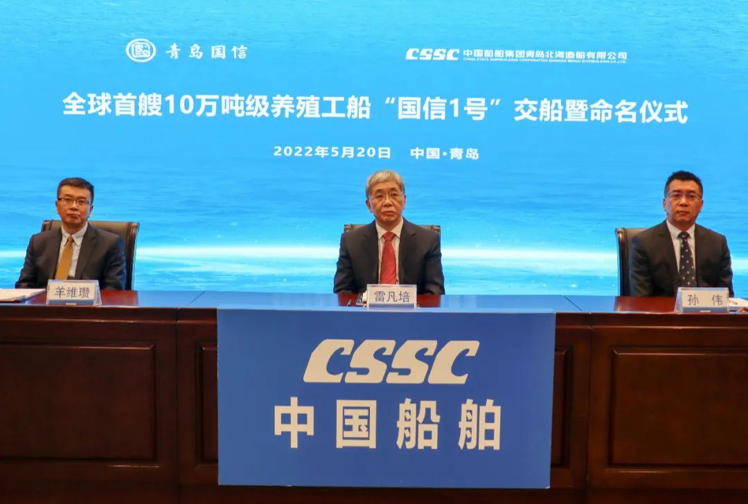 5月20日,中國(guó)船舶集團(tuán)旗下青島北海造船有限公司為青島國(guó)信發(fā)展(集團(tuán))有限責(zé)任公司建造的全球首艘10萬(wàn)噸級(jí)智慧漁業(yè)大型養(yǎng)殖工船“國(guó)信1號(hào)”交船命名儀式在青島舉行。中國(guó)船舶集團(tuán)黨組書記、董事長(zhǎng)雷凡培,黨組成員、副總經(jīng)理孫偉通過(guò)視頻出席儀式,山東省人民政府黨組成員、副省長(zhǎng)凌文,青島市委副書記、市長(zhǎng)趙豪志,中國(guó)海洋大學(xué)黨委副書記、校長(zhǎng)于志剛,中國(guó)工程院院士麥康森等領(lǐng)導(dǎo)和嘉賓出席儀式。青島市副市長(zhǎng)趙燕為新船命名。