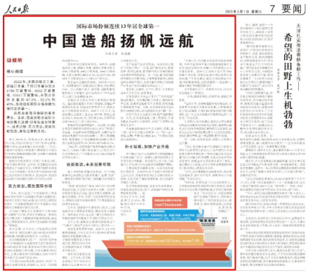 3月1日,《人民日報》報道,中國造船業國際市場份額已連續13年位居全球第一,中國船舶集團堅持創新驅動,液化天然氣運輸船訂單取得新突破,首制國產大型郵輪緊鑼密鼓施工中,旗下企業深入推進數字化轉型。一起來看詳細報道。