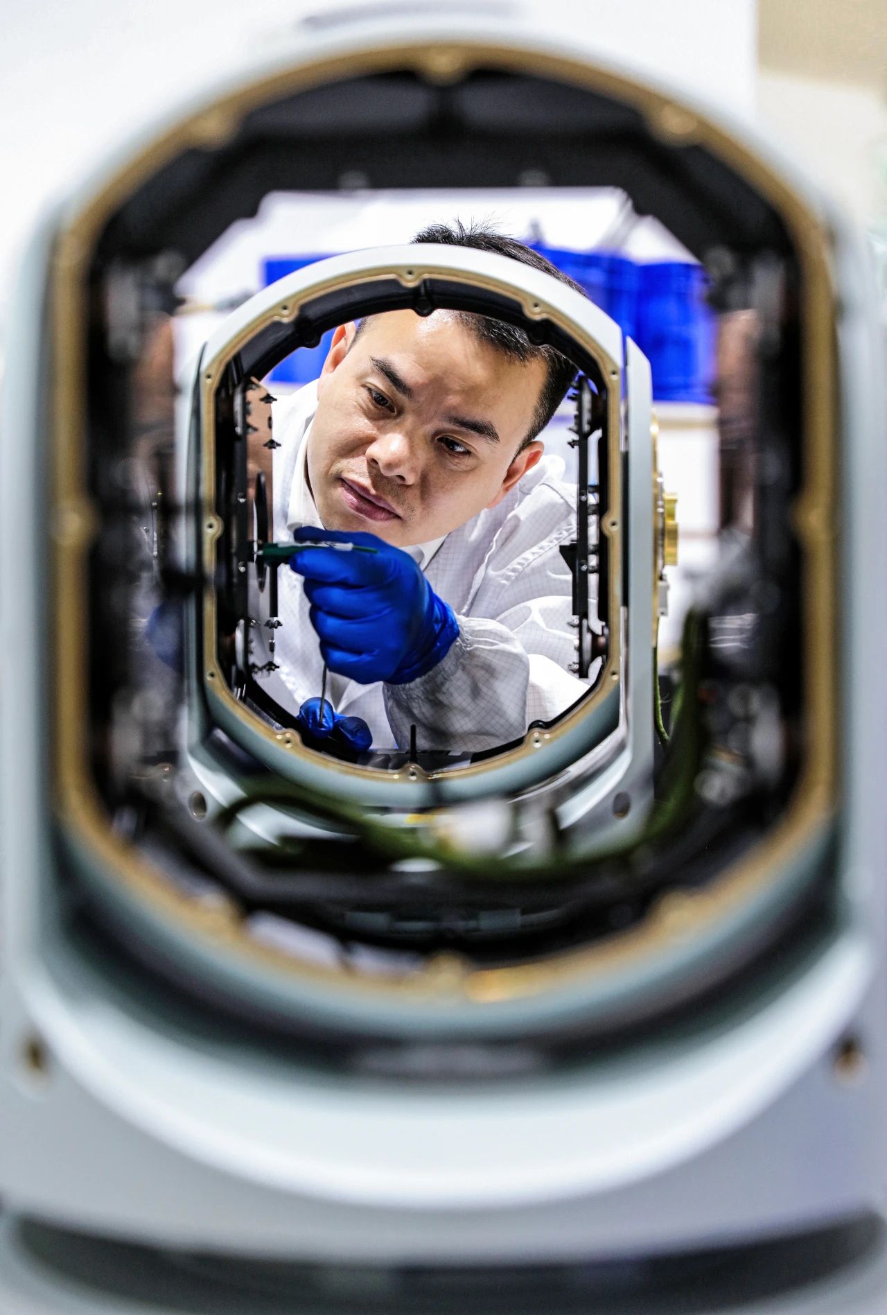 七一七所技術人員正在裝調光軸,確保光路的穩定傳導,在精確裝調中堅守本心、求精求新,以匠心確保產品精度。
