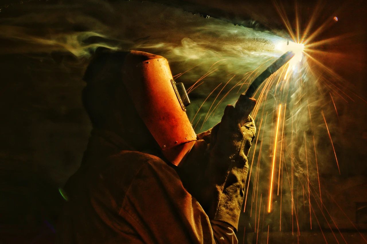 利用慢門記錄造船工人在氣刨時的工作場面。
