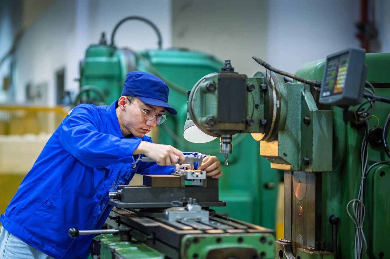 一位工人正在認真的檢查組裝好的齒輪箱,確保其高質量產出,驅動公司產業發展。