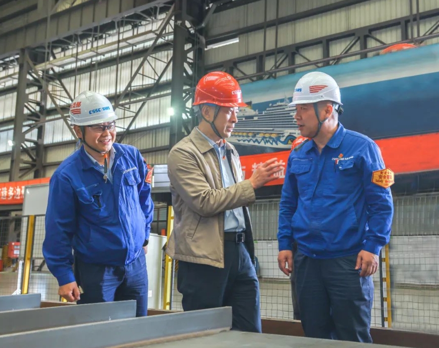 在相關(guān)二級管理單位,徐鵬調(diào)研了相關(guān)重點(diǎn)實(shí)驗(yàn)室、車間和在建的國產(chǎn)大型郵輪“愛達(dá)·花城號”,與一線職工深入交流,并聽取了單位負(fù)責(zé)人關(guān)于經(jīng)營生產(chǎn)、公司治理、深化改革、隊(duì)伍建設(shè)、黨的建設(shè)等方面情況匯報(bào)。