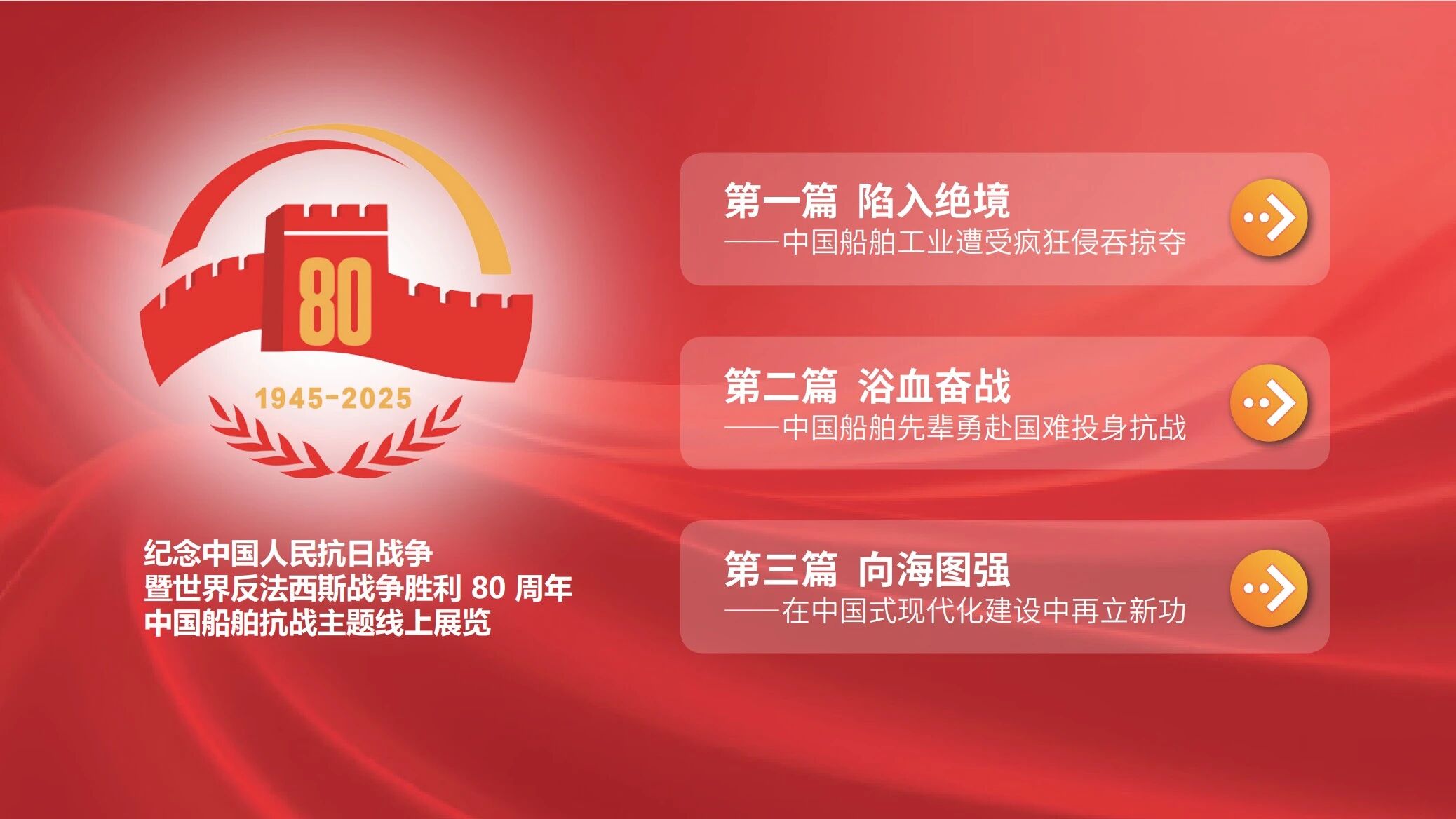 9月4日,在紀念中國人民抗日戰(zhàn)爭暨世界反法西斯戰(zhàn)爭勝利80周年之際,中國船舶集團有限公司“追尋紅色記憶 弘揚抗戰(zhàn)精神”主題線上展覽上線發(fā)布。